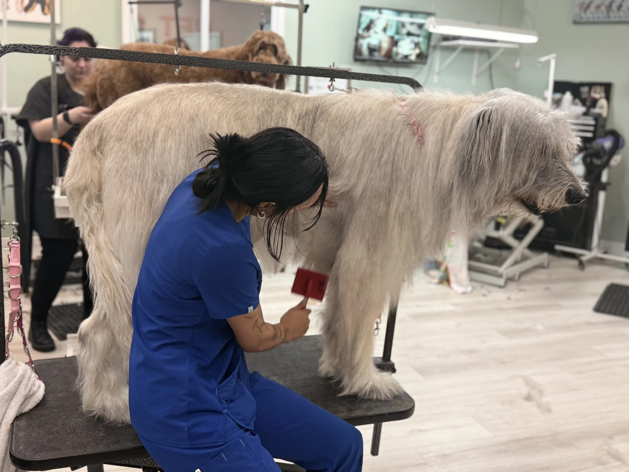 Includes bath with appropriate shampoo, blow dry, nails clipped and filed, ears cleaned and hair removed, anal glands expressed, and breed appropriate full body hair trim or shave.